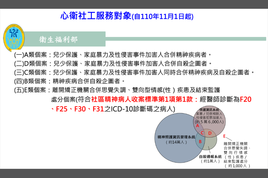 (一)合併多元議題個管工作。(只要合併兩種以上就是收案對象:精神疾病、兒少保護加害人、家庭暴力加害人、性侵害加害人及結束監護處分之個案)